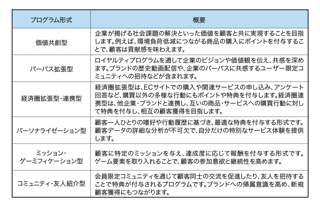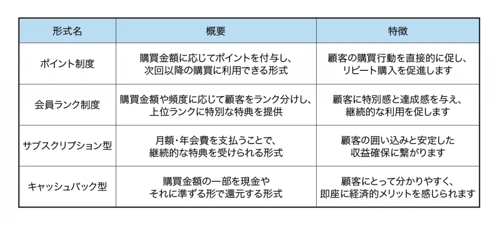 ロイヤルティプログラムには多種多様な形式が存在するため、自社の目的や顧客層に合った最適な形式を選ぶことが重要です。