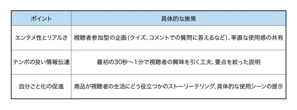 • 使用シーンの提示: 商品がどのように役立つのか、具体的な使用シーンを見せることで、視聴者の購買意欲を高めます。