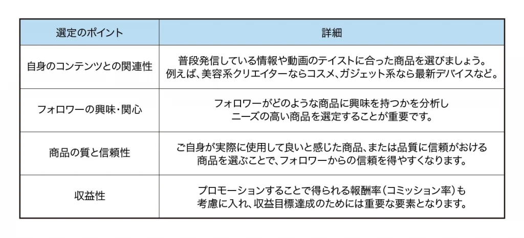 これらの条件を確認し、スムーズに登録を進めましょう。登録が完了したら、プロモーションしたい商品を選定するステップに進みます。