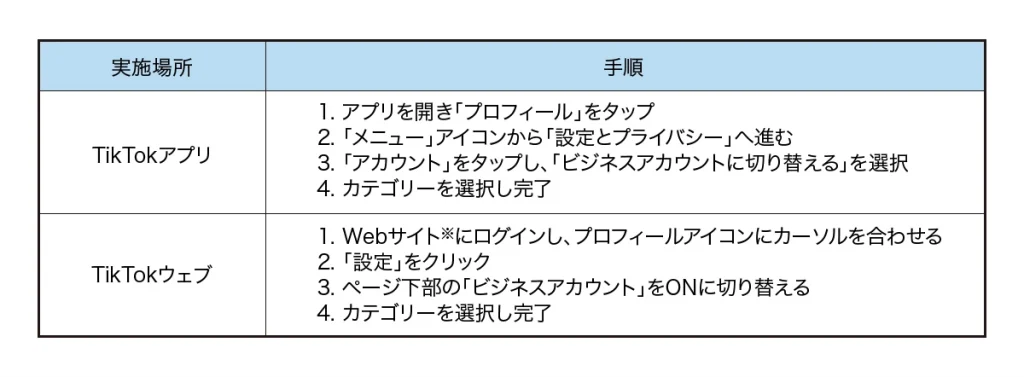 TikTok Shopクリエイターとして活動を始めるには、まずお持ちのTikTokアカウントを「ビジネスアカウント」へ切り替える必要があります。