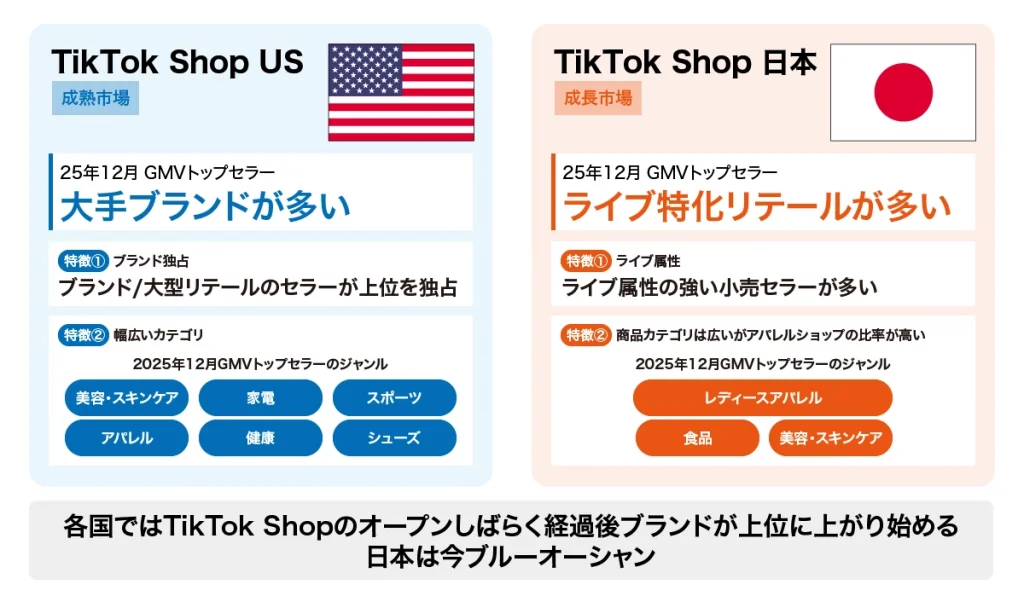 特筆すべきは、日本市場におけるライブコマース経由の売上比率の高さです。現在の日本では、精緻に作り込まれた広告動画よりも、ライブ配信を通じた「双方向のコミュニケーション」が売上の主軸となっています。